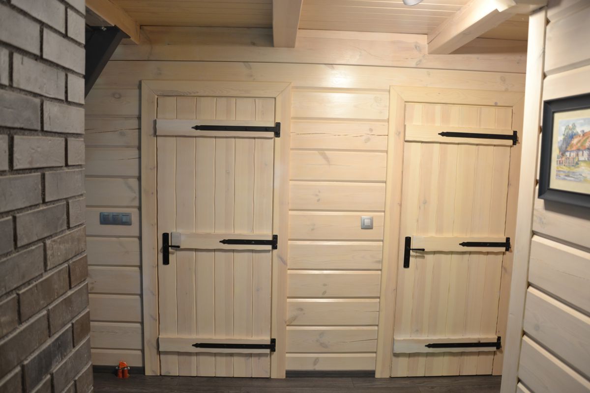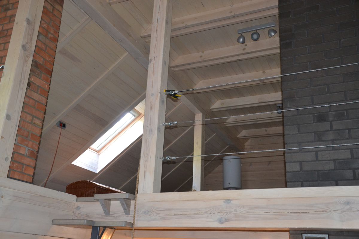 Strop: nad połową domu, belkowy, drewniany, Belki stropowe widoczne na suficie, pomiędzy belkami deska 2x12cm, wygłuszenie wełną legary i podłoga sosnowa poddasza.